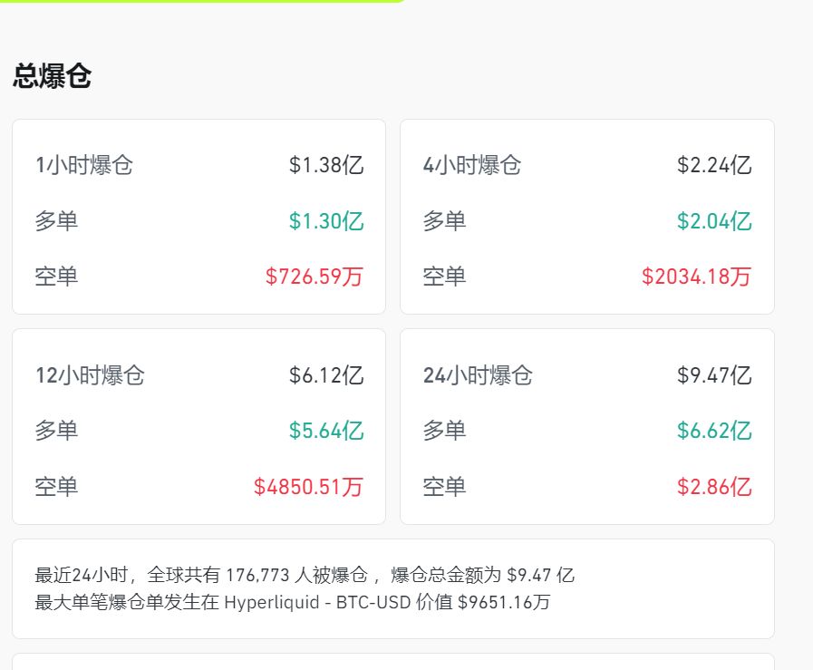 据Coinglass数据显示,24小时内,全网共有176721人被爆仓,爆仓总金额为9.47亿美元(约合人民币67亿元),这一数字凸显了加密货币市场的高风险性。