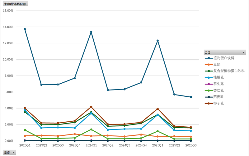 马上赢数据显示,植物奶(植物蛋白饮料)在线下零售货架的SKU数量从2023Q1(2023年一季度)的3596个增至2024Q1的3883个,至2024Q4再次回落到3592个。不过自2025年开始,植物奶SKU数量有所回升,截至2025Q3增至4647个。不过,植物奶在包装饮料市场的份额已从2023Q1的13.72%降至2025Q3的5.38%。