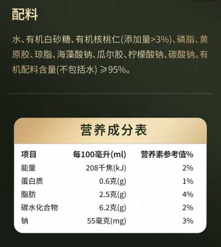 上述宣称“营养之选核桃仁……≈4.6倍牛奶蛋白质含量”的三只松鼠甄养有机核桃乳……实际蛋白质含量仅为0.6g/100mL。如果按一瓶牛奶250毫升、每100毫升含有2.9克蛋白质计算……则需饮用5瓶同规格的三只松鼠甄养有机核桃乳……才能达到一瓶牛奶的蛋白质含量。仔细查看产品页面可以发现……其“4.6倍牛奶蛋白质含量”下方配有小字号注解:“根据《中国食物成分表(标准版)》第6版第二册……