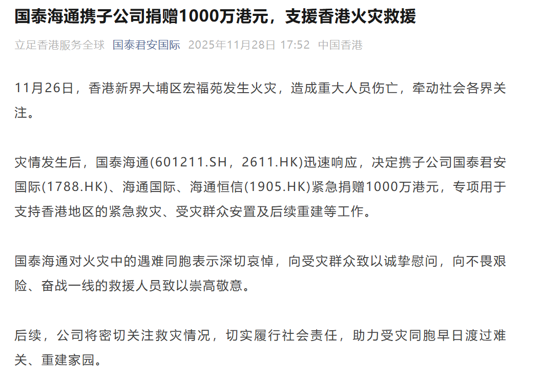 11月28日,国泰海通迅速响应,决定携子公司国泰君安国际、海通国际、海通恒信紧急捐赠1000万港元,专项用于支持香港地区的紧急救灾、受灾群众安置及后续重建等工作。