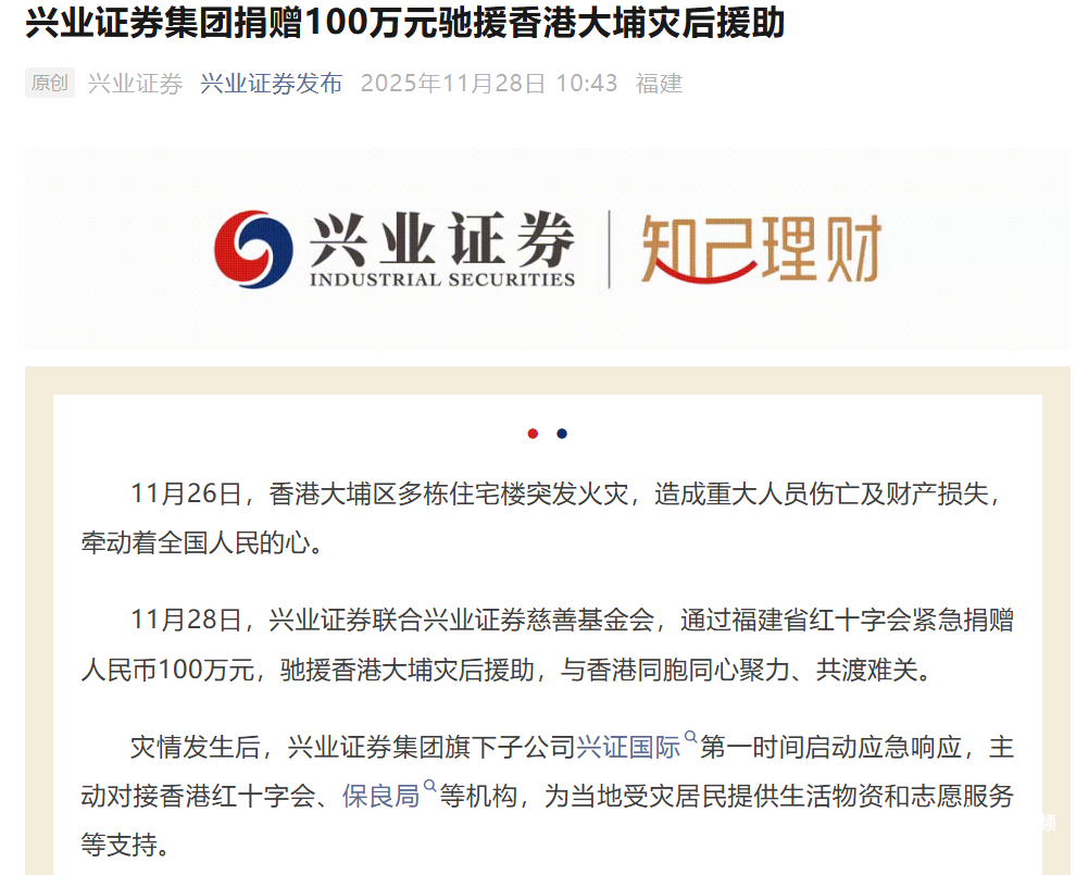 11月26日下午,香港新界大埔宏福苑发生五级火灾。灾情发生后,社会各界迅速响应,多家券商机构纷纷捐款捐物,支持受灾居民的紧急安置、生活保障和灾后重建工作。