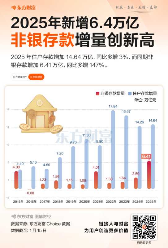 中国人民银行1月15日发布的数据显示,2025年非银行业金融机构人民币存款(下称非银存款)增加6.41万亿元,年度增量比上年大幅提高147%,并且超过2015年的4.08万亿,创有统计数据以来新高。非银存款2025年末总额为35.56万亿。