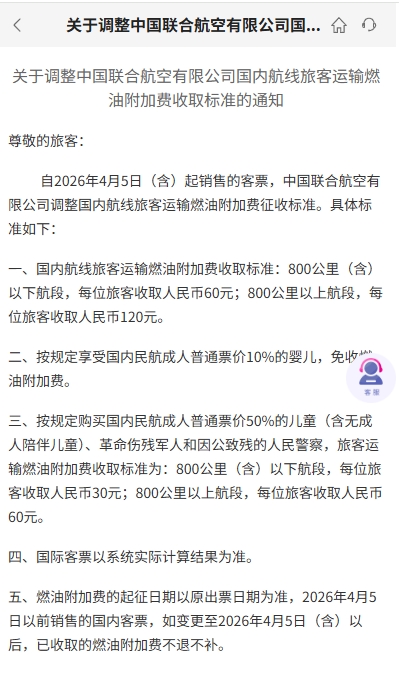 同日,中国联合航空有限公司也宣布自4月5日起上调国内航线燃油附加费。