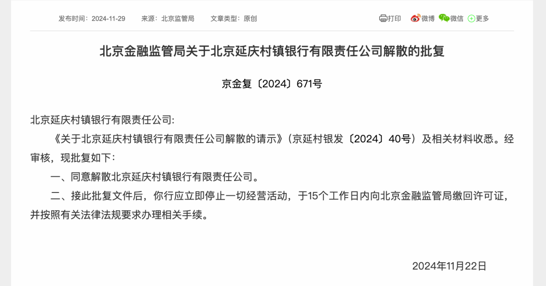 11月29日,金融监管总局官网披露,北京延庆村镇银行因被北京银行收购而获批解散,同时,北京银行亦获批收购北京昌平发展村镇银行,并设立分支机构。