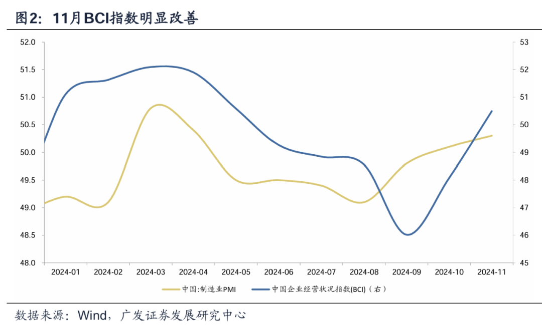 11月制造业PMI环比回升0.2个点至50.3,超出季节性增长预期,表明稳增长政策初见成效。同时,BCI指数也环比上行2.41个点至50.49,两者信号一致,均指向经济景气度回暖。中小型企业改善幅度更大,尤其是民营中小企业,BCI指数时隔5个月重回荣枯线上方。此外,预期改善幅度超越现实,制造业PMI经营活动预期指数接近季节性波动上限。制造业内部行业分化持续,新兴及装备制造领域景气度领先,消费品行业中耐用消费品表现更佳。建筑业PMI走低,但服务业PMI保持稳定。