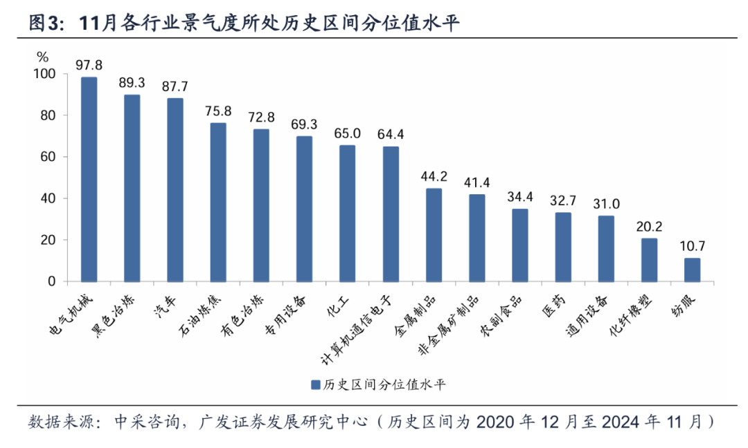 15个细分行业中,9个行业处于景气扩张区间,高于前三季度均值。其中,通用设备、农副食品、纺服等行业景气回落,而专用设备、电气机械等行业景气回升。