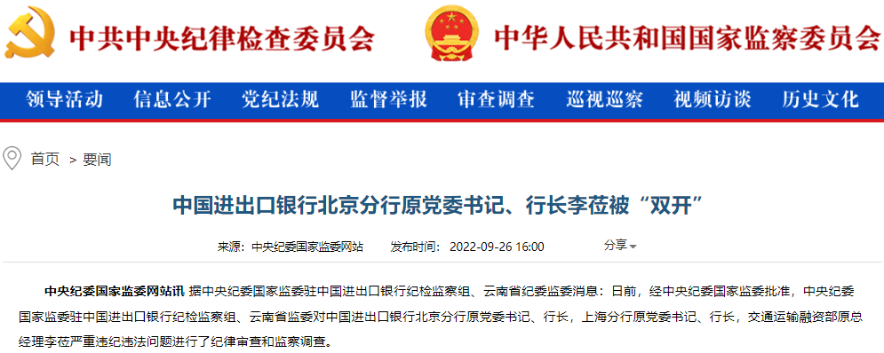 中央纪委国家监委网站9月26日消息,中国进出口银行原北京分行及上海分行党委书记、行长,交通运输融资部原总经理李莅,因严重违纪违法被开除党籍、政务开除。通报指出,李莅违反多项党的纪律和国家法律法规,包括政治纪律、中央八项规定精神、组织纪律、廉洁纪律、工作纪律等,涉嫌受贿犯罪。