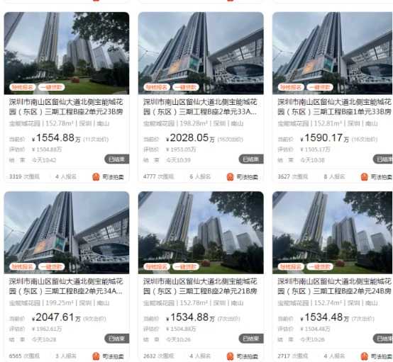 据周边房产中介透露,宝能城花园的二手房成交价曾高达每平方米15万元,目前挂牌价与法拍起拍价存在每平方米两万元以上的价差。