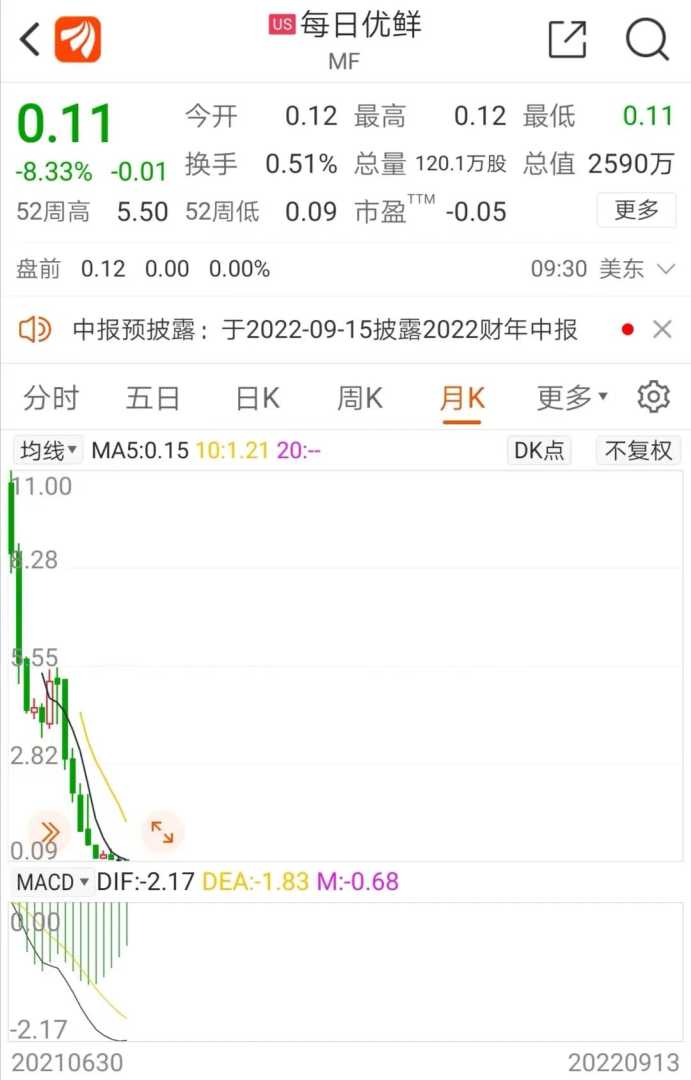 回顾每日优鲜的发展历程,从2014年成立到2021年在美纳斯达克上市,每日优鲜曾被誉为“生鲜电商第一股”。然而,上市不到两年,每日优鲜便陷入了撤城收缩、拖欠货款、年报难产、清退员工、破产等风波。13日美股交易时段,每日优鲜股价大幅下跌,相比上市初的最高价,如今已跌去99%。