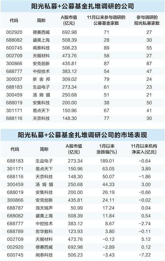 值得注意的是,阳光私募的调研风格与公募基金略有差异,两者无重合调研的公司接近300家,占比超过四成。这显示了不同投资机构在选股策略上的差异性和多样性。
