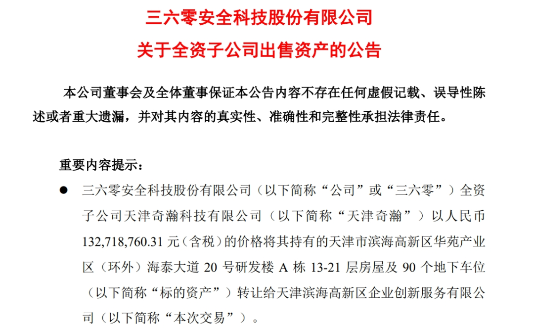 11月29日,企业家周鸿祎掌舵的三六零公司发布公告,其全资子公司天津奇瀚科技有限公司达成了一项重要资产出售协议,以1.33亿元的价格将位于天津市滨海高新区华苑产业区(环外)海泰大道20号的研发楼A栋13-21层及90个地下车位,转让给天津滨海高新区企业创新服务有限公司。