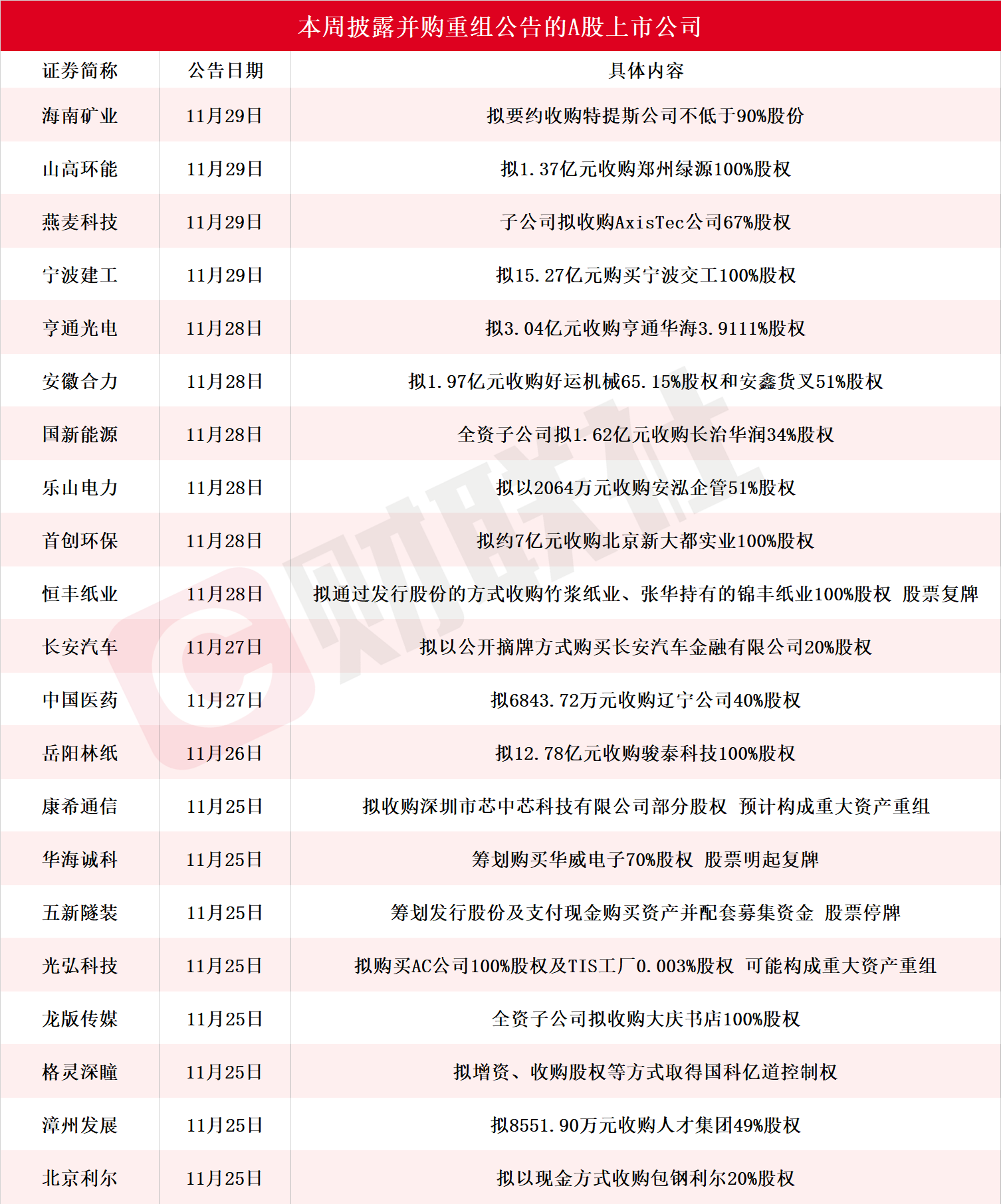 据统计,本周披露并购重组进展的A股上市公司共有21家,包括海南矿业、山高环能、燕麦科技、宁波建工、亨通光电、安徽合力等。其中,漳州发展因拟现金收购九龙江集团和城投集团持有的股权而连续四个交易日收盘涨停。此次收购将助力漳州发展进一步拓展数字经济和人才服务领域。
