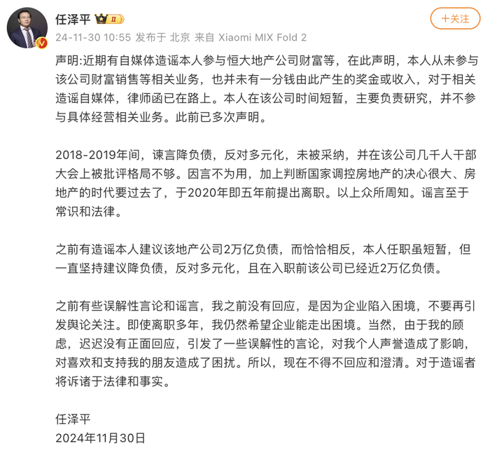 任泽平在声明中进一步指出,他在恒大地产公司的任职时间短暂,主要职责是研究,并未涉及具体经营业务。他强调,之前对于某些误解性言论和谣言未予回应,是出于对企业困境的考虑,不希望进一步引发舆论关注。然而,这些谣言不仅对其个人声誉造成了影响,也给喜欢和支持他的朋友带来了困扰。因此,他决定不得不进行回应和澄清,并将对造谣者采取法律手段。