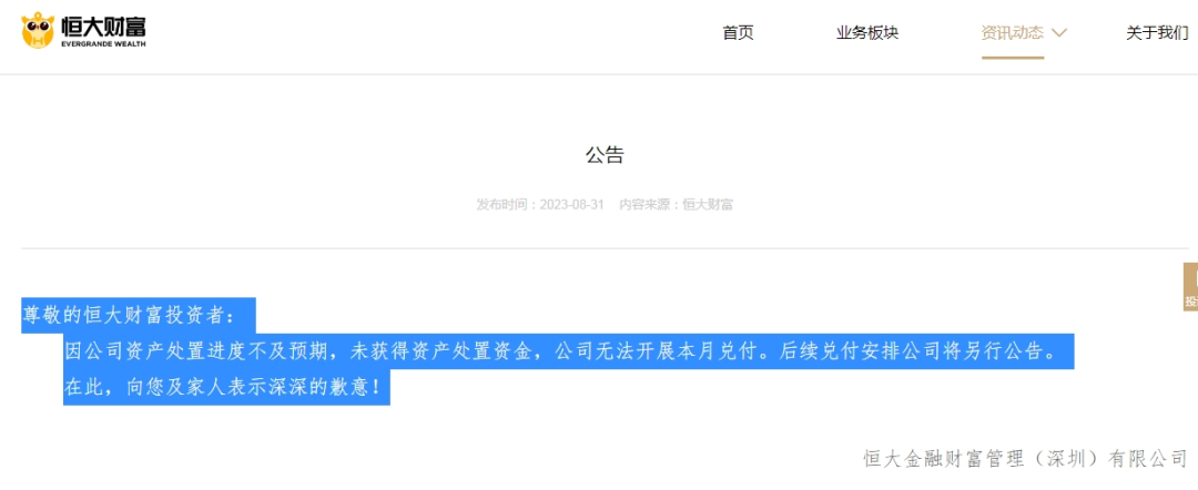 2021年9月恒大财富提出了最初的兑付方案,包括现金兑付、实物资产抵扣以及冲抵购房尾款等方式。然而,兑付进度一直未能如愿。2023年8月31日,恒大财富微信公众号发文称,因公司资产处置进度不及预期,未获得资产处置资金,公司无法开展本月兑付,后续兑付安排将另行公告。
