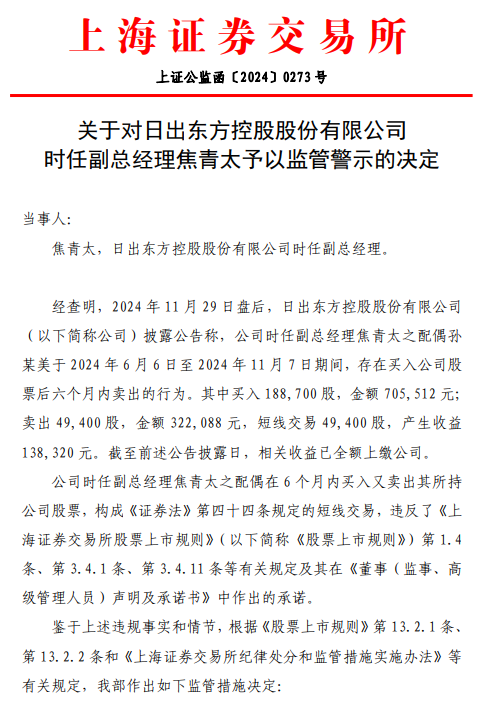 11月29日,上交所对日出东方控股股份有限公司时任副总经理焦青太发出监管警示,因其配偶在6个月内进行股票的买入与卖出操作,构成短线交易,违反了相关法规及承诺。