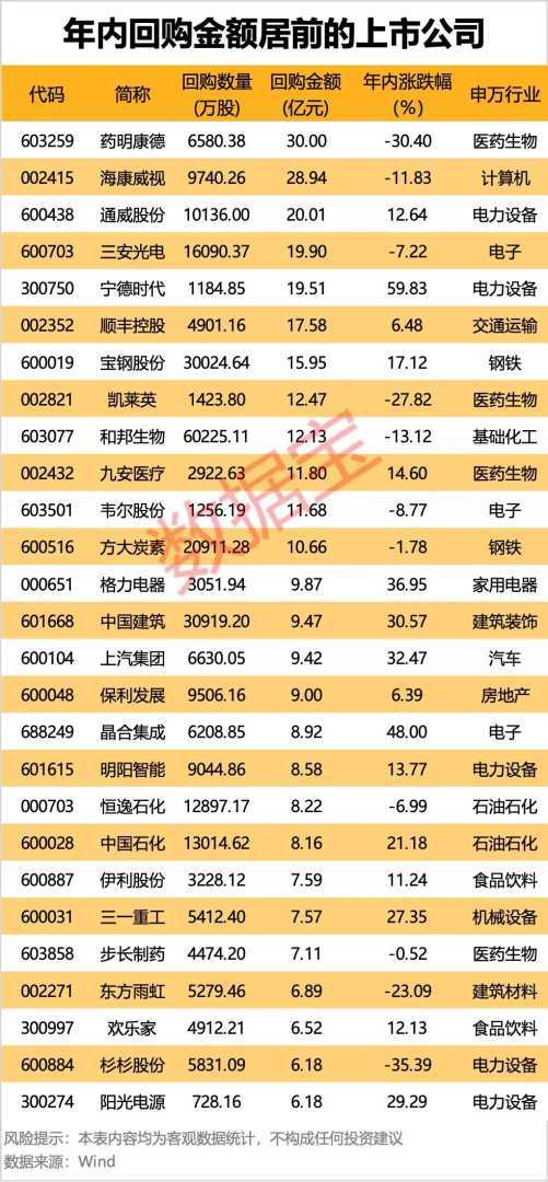 据证券时报·数据宝统计,截至11月28日,年内已有2085家A股上市公司实施回购,金额合计达到1573.04亿元,远超2023年全年。其中,药明康德、海康威视、通威股份分别以高额回购金额排名前三。