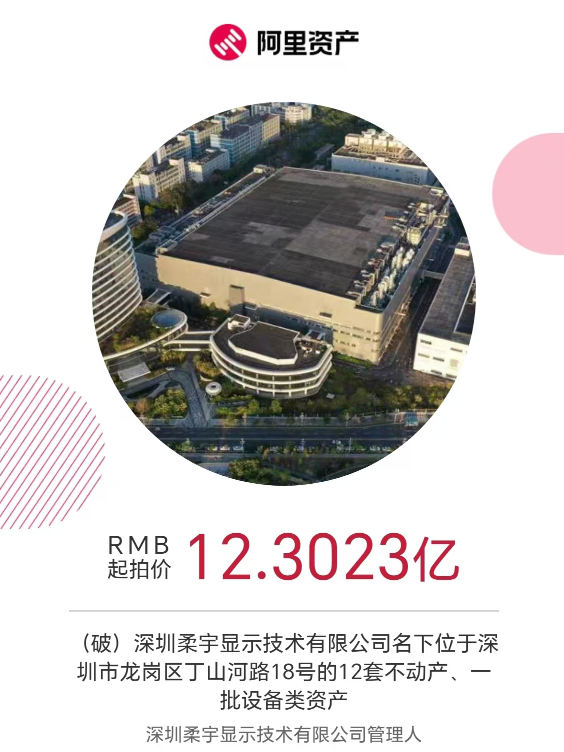 11月28日,第一财经记者独家报道,已进入破产清算阶段的柔宇显示公司资产正式登陆淘宝“阿里资产”平台,即将于12月14日10点起拍,起拍价约为12.3亿元。拍卖标的包括柔宇显示位于深圳龙岗区的不动产及设备类资产。