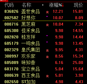 食品股在尾盘也出现异常波动,好想你、黑芝麻、桂发祥等个股涨停。