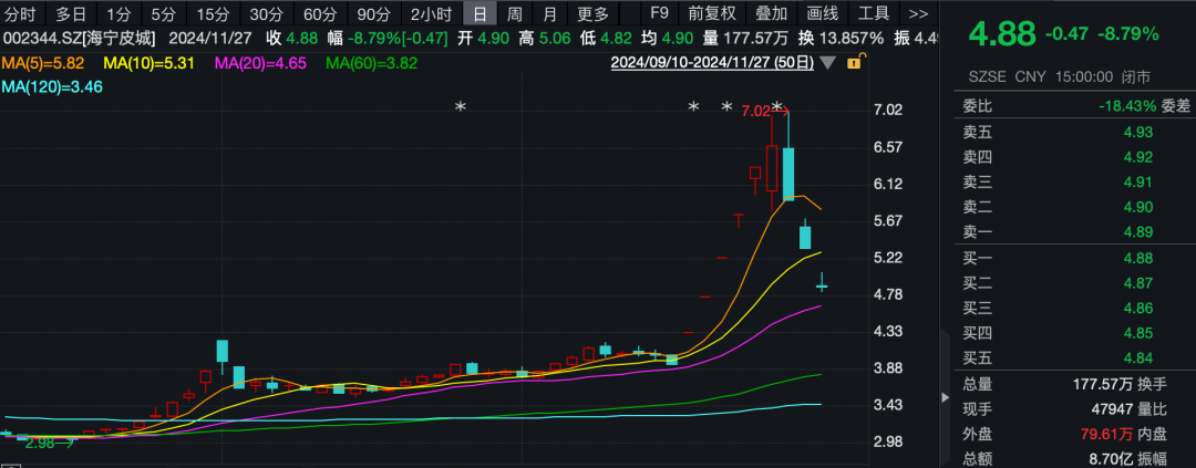 观察海宁皮城近期股价走势,可以发现其股价在减持公告前经历了一波大幅波动。自11月15日起,海宁皮城股价连续上涨,并在11月22日和25日达到高点,随后大幅下跌。而宏达高科的减持均价恰好位于这一波上涨的高点,减持时机把握得相当精准。