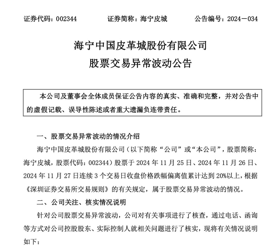 此外,海宁皮城在11月27日发布了股票交易异常波动公告,称公司股票在2024年11月25日至27日期间连续3个交易日收盘价格跌幅偏离值累计达到20%以上。经核查,公司未发现其他应披露而未披露的重大事项,控股股东及实际控制人在异常波动期间也未进行股票买卖。