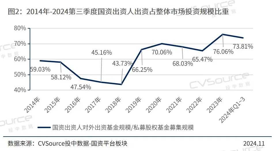 从募资端来看,国资出资人在市场募资环境较好的年份中,出资基金规模占比在60%左右。而在资管新规等因素的影响下,募资遇冷后,该比例上升至70%以上。截至2024年第三季度,国资出资人出资占整体市场投资规模比重已达73.81%。