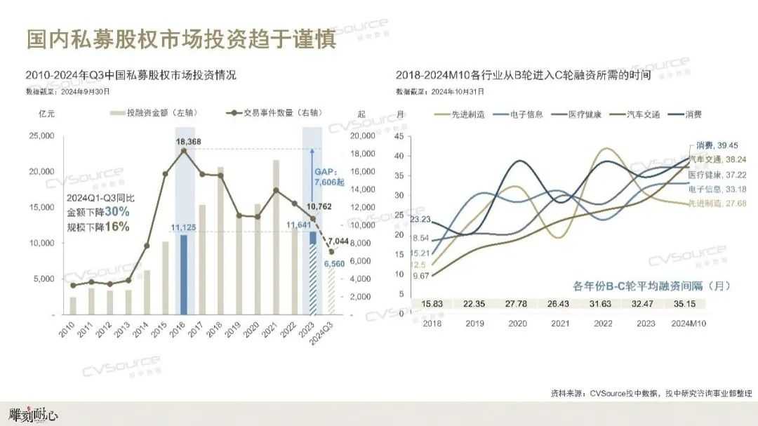 在投资端,行业规模整体收缩。根据投中研究院的数据,一级市场的投资规模在2023年为11641亿元,而截至2024年三季度,投融资规模已下滑至6560亿元,同比下滑30%。投资事件数量也同比下滑16%。