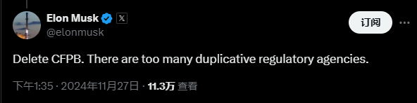 当地时间周三(11月27日),特斯拉CEO埃隆·马斯克在社交媒体X上针对其他帖文发表评论,直言不讳地提出“取缔CFPB(消费者金融保护局)”,并批评此类重复的监管机构数量过多,造成了不必要的冗余。