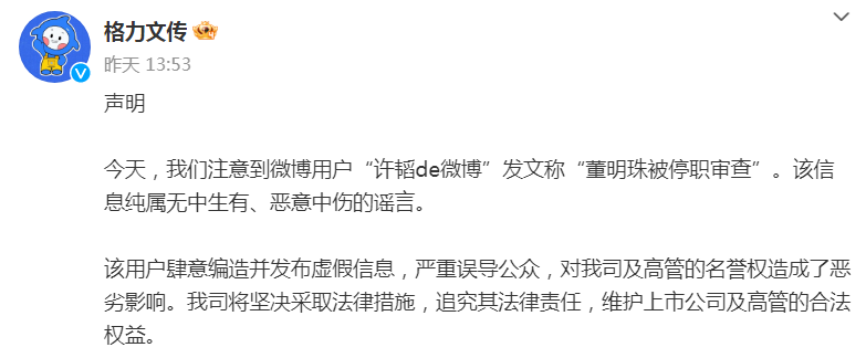 声明中,格力文传严厉谴责了微博用户“许韬de微博”的不实言论,该用户发布的信息严重误导了公众,对格力电器及其高管的名誉造成了不可估量的损害。格力电器表示,将采取果断的法律手段,追究造谣者的法律责任,以维护公司及高管的合法权益。