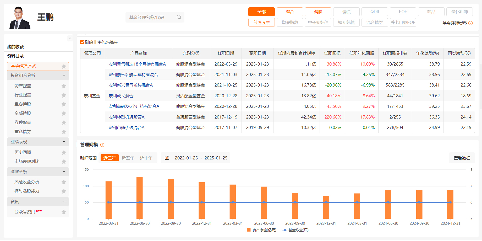 然而,市场总是充满变数。在2021年至2023年期间,王鹏管理的三款产品未能实现正收益率,基本亏损在20%左右,管理资产规模也因此大幅缩水。尽管在2024年,王鹏旗下产品的一年收益率几乎全部超过60%,成为宏利基金当年收益的亮点,但这一时期的波动无疑对他的职业生涯产生了一定影响。