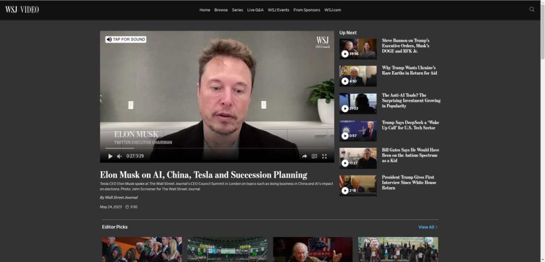 网传“马斯克突然安排后事”的说法有误。相关视频在2023年5月已经出现,当时特朗普尚未重返白宫并组建新政府。视频画面源自《华尔街日报》的一档访谈节目,马斯克在视频中谈到了与公司继任者相关的话题。