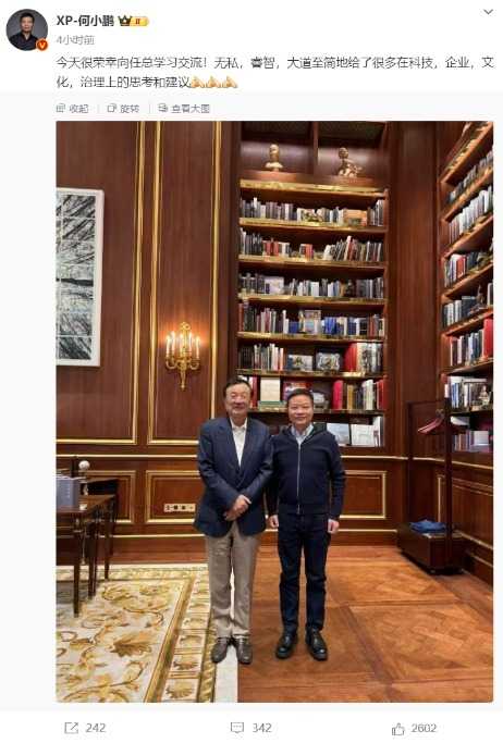 同一天,何小鹏在微博发布与任正非合影照片,并表示“很荣幸向任总学习交流”。