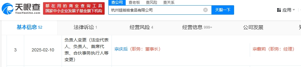 天眼查App显示,近日,杭州娃哈哈食品有限公司发生工商变更,宗庆后卸任法定代表人、董事长,由宗馥莉接任法定代表人并担任董事、经理,同时,多位主要人员均发生变更。