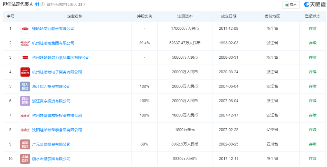 截至目前,真宗投资有限公司对外投资了15家企业,包括沈阳娃哈哈乳品有限公司、大理娃哈哈食品有限公司等。启力投资有限公司对外投资了26家企业,包括杭州娃哈哈食品饮料营销有限公司、青海娃哈哈食品有限公司等。