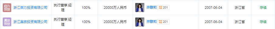 去年12月,天眼查信息显示,浙江真宗投资有限公司、浙江启力投资有限公司均发生工商信息变动。上述两家投资公司中,杭州娃哈哈集团有限公司基层工会联合委员会退出股东行列,宗馥莉持股比例升至100%。