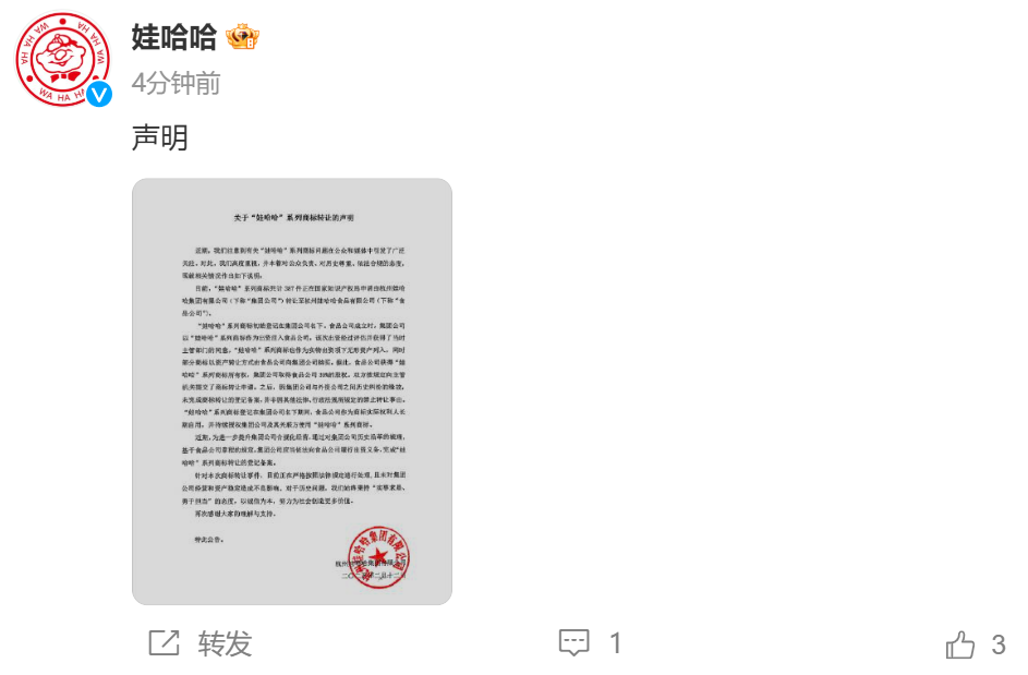 对此,2月12日午间,娃哈哈集团在官方微博发布关于“娃哈哈”系列商标转让的声明称,近期,公司注意到有关“娃哈哈”系列商标问题在公众和媒体中引发了广泛关注。对此,公司高度重视,现就相关情况作出说明。