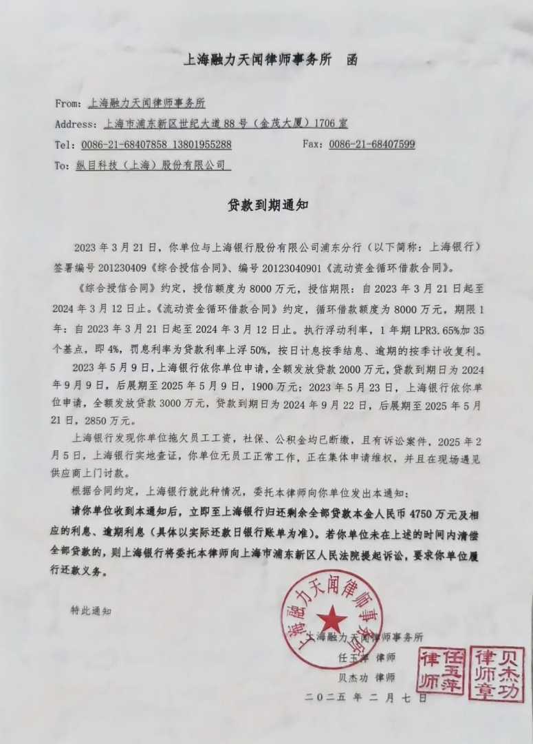 证券时报记者2月11日实探纵目科技及其子公司蚕丛机器人的办公地点发现,整幢办公楼已人去楼空,玻璃正门已被白幕遮盖。在公司前台,贷款到期通知、社会保险费限期缴纳通知书等告示被贴在了最显眼的位置,表明公司资金流或已枯竭。公司一楼,“智能驾驶数据合规室”等办公间门口已充斥着各类物件,员工寄来的“被迫解除劳动合同通知书”等文件杂乱无章地堆砌在此。
