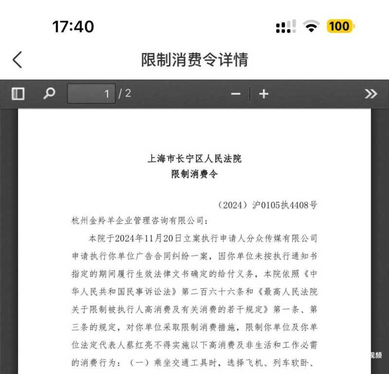 2月10日,上海市长宁区人民法院发布限制消费令称,因在广告合同纠纷案中未能在规定时间内履行给付义务,杭州金羚羊企业管理咨询有限公司(下称“杭州金羚羊公司”)成为被执行人,公司及法定代表人蔡红亮被法院采取限制消费措施,案件涉及的金额为1125.07万元。