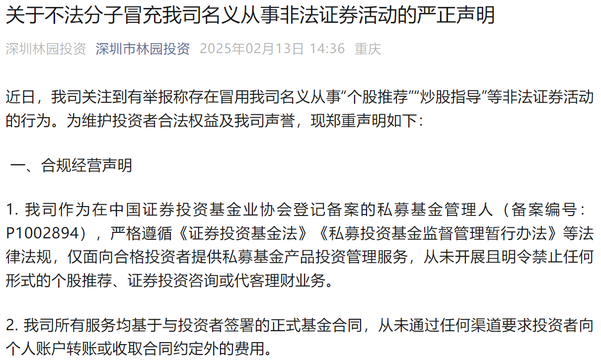 声明还指出,任何以“林园投资管理有限责任公司员工”“合作机构”等名义,通过微信群、直播平台、社交软件等渠道提供“个股推荐”“内幕消息”“收益分成”等服务的活动,均属违法冒用公司名义的诈骗行为,与公司无任何关联。
