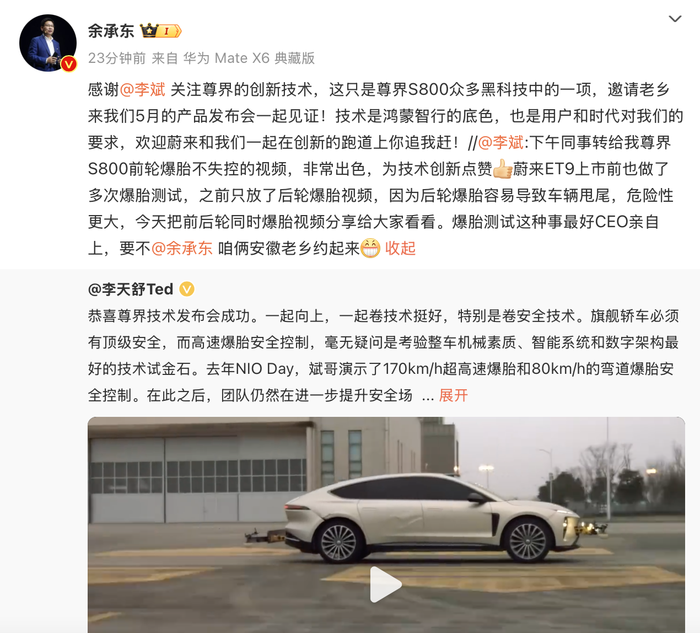 余承东回应蔚来创始人爆胎测试邀约,尊界S800展现黑科技