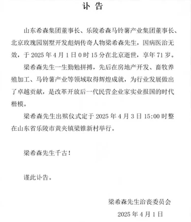 4月1日,“希森薯业”微信公众号发布讣告,山东希森集团董事长、乐陵希森马铃薯产业集团董事长梁希森先生因病医治无效,于2025年4月1日0时15分在北京逝世,享年71岁。