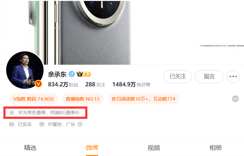 余承东,最新动向揭晓。4月4日,据华为官网消息,余承东的介绍信息及微博、抖音认证信息已更新为“华为常务董事、终端BG董事长”,原先“智能汽车解决方案BU董事长”的身份认证已被取消。