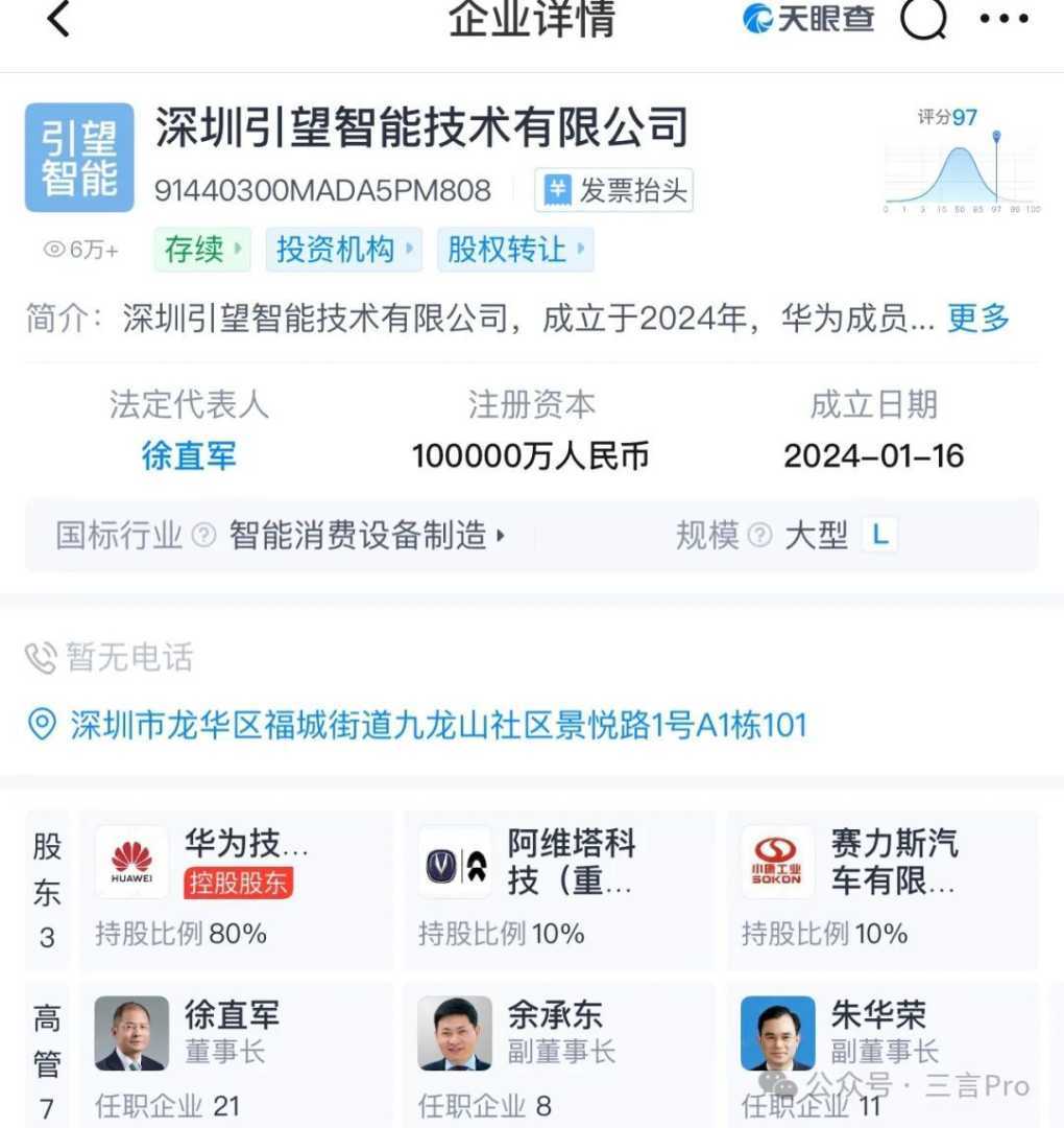 3月31日,深圳引望智能技术有限公司发生工商变更,法定代表人变更为徐直军,华为持股降至80%,新增阿维塔科技和赛力斯汽车为股东。