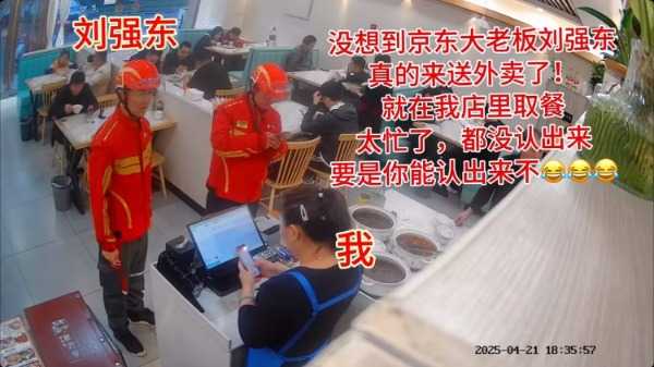餐馆老板发布的视频显示,刘强东与另一位京东外卖员一同前来取餐。期间,刘强东与老板进行了简短沟通。同行的京东外卖员取餐后将餐品交给了刘强东,随后两人便离开了餐馆,整个取餐过程仅持续了一分多钟。