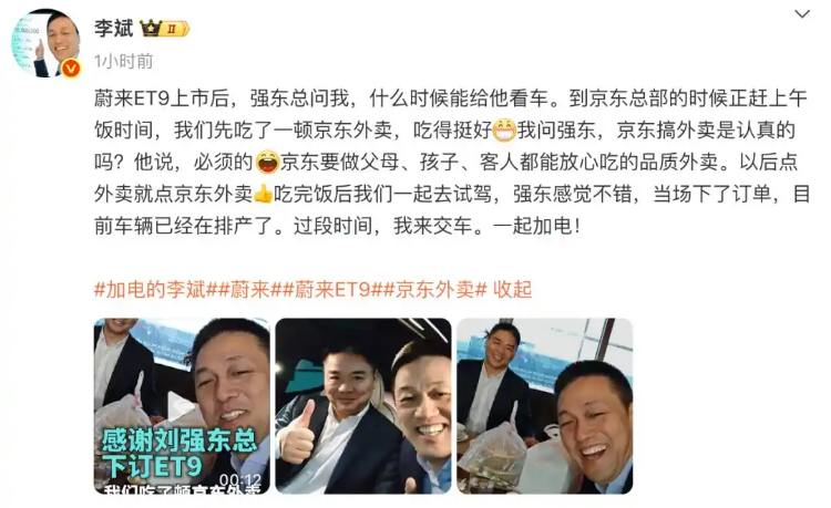 此前,蔚来创始人李斌也在社交平台上发布了与刘强东一起吃外卖的视频。刘强东在视频中表示:“京东搞外卖是认真的,我们要做父母、孩子、客人都能放心吃的品质外卖。”