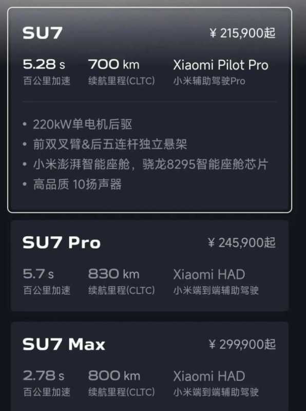 小米汽车App显示,小米SU7标准版搭载的Xiaomi Pilot Pro更名为“小米辅助驾驶Pro”,此前名为“小米智驾Pro”。小米SU7Pro、小米SU7Max、小米SU7Ultra搭载的Xiaomi HAD,更名为“小米端到端辅助驾驶”,此前名为“小米智驾Max”。