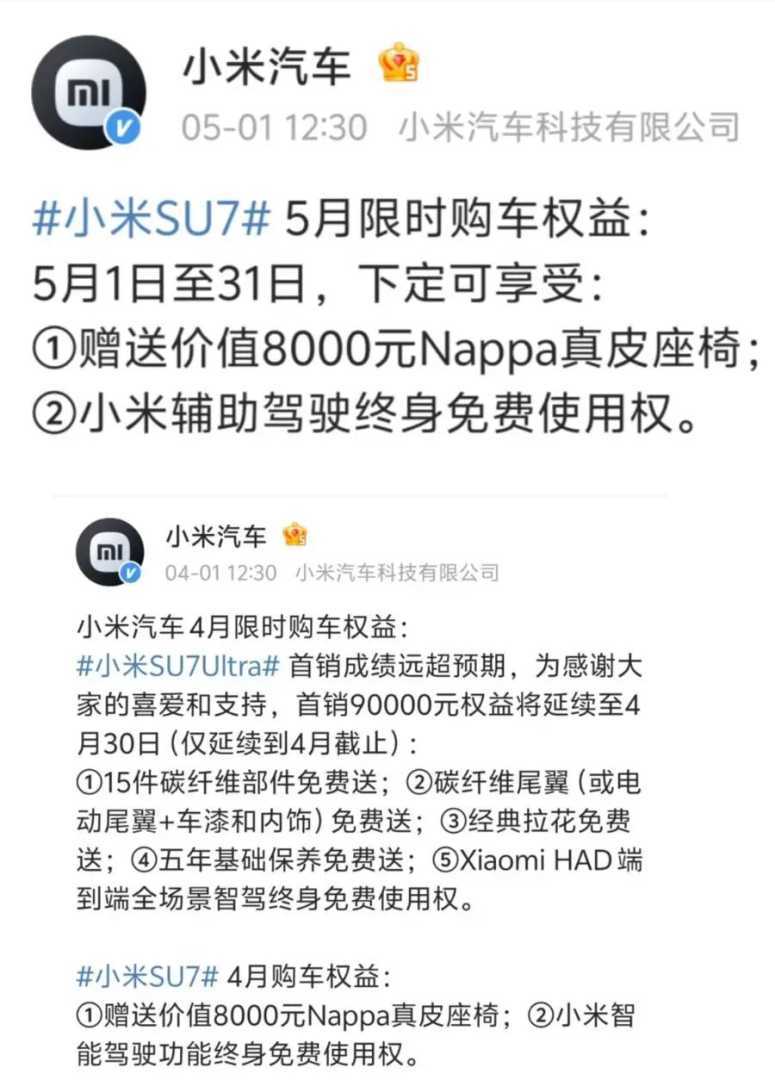 上述更名早有迹象。5月1日,小米汽车微博称,小米SU7的5月限时购车权益包括“小米辅助驾驶终身免费使用权”。