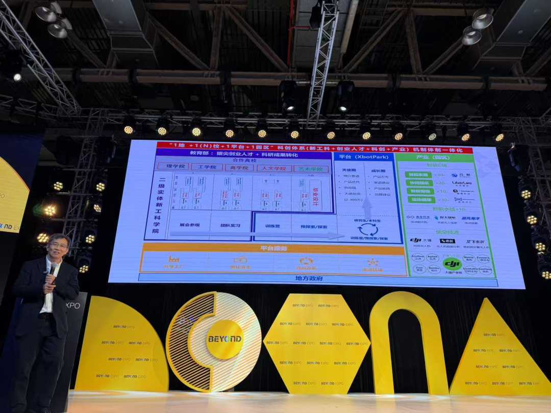 李泽湘作为XbotPark机器人基地创始人,分享新工科教育理念,强调打破大学与产业鸿沟。他参与孵化大疆等企业,成为中国科创产业关键人物。其教育理念已复制到全国各地,推动科创发展。