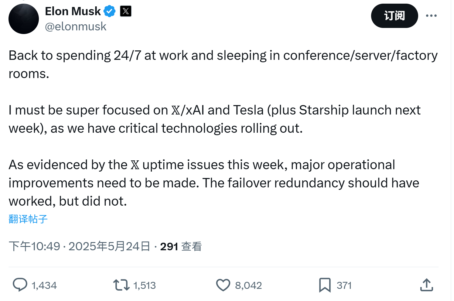 世界首富马斯克表示重回7x24小时工作状态,全力推进X/xAI、特斯拉及下周的星舰发射等关键技术。X平台本周遭遇运行中断,凸显出运营改进紧迫性。