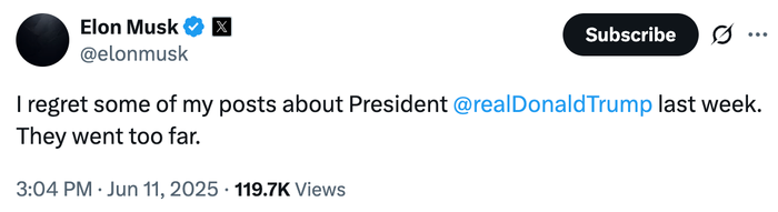 美东时间11日凌晨,特斯拉与SpaceX首席执行官埃隆·马斯克在其社交媒体平台“X”上发表声明,对上周发表的一些关于美国总统特朗普的帖子表示后悔,称“内容表达过于激烈”。