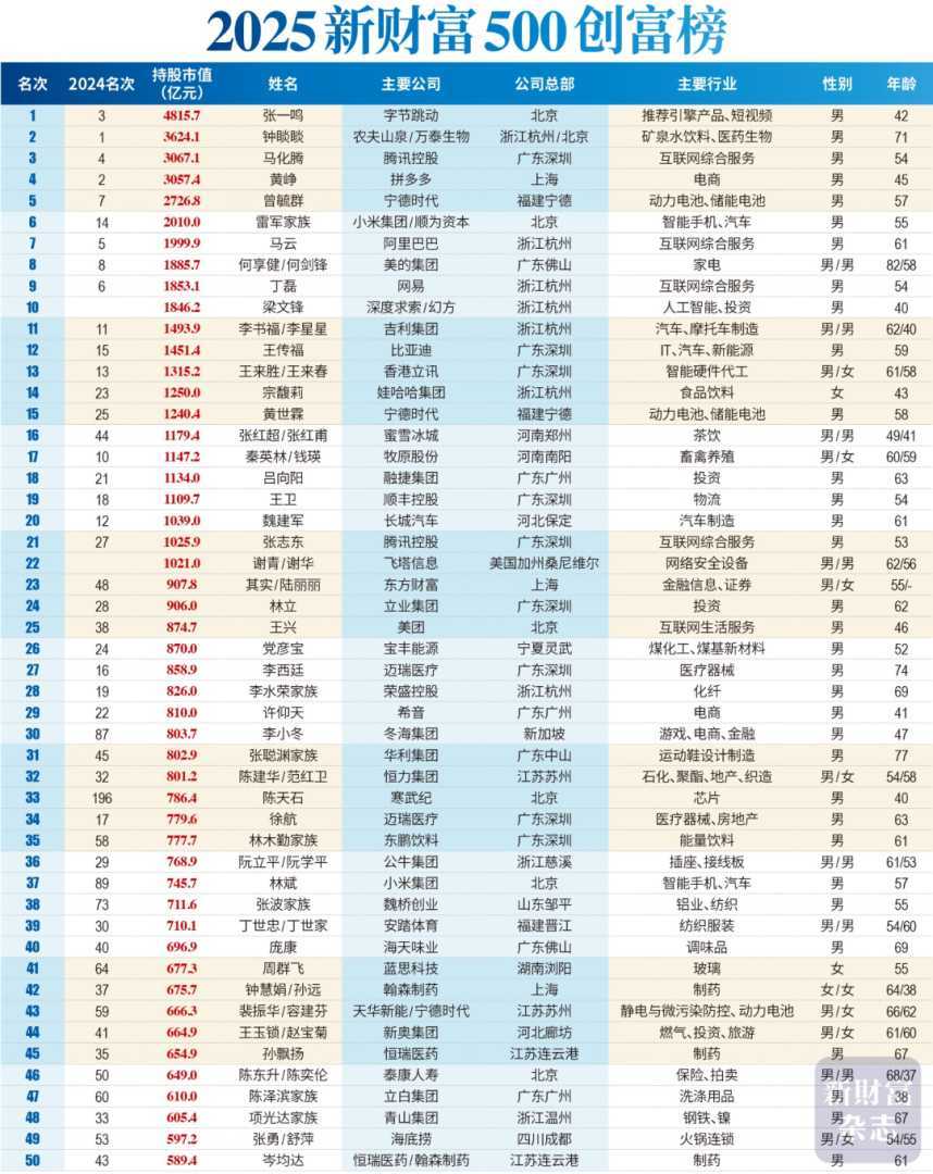 《新财富》杂志发布第23期500创富榜,字节跳动创始人张一鸣以4815.7亿元持股市值首次问鼎中国首富,凸显TMT行业主导地位,AI技术改写财富格局。